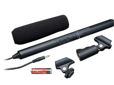 Designed for 'video production and broadcast (ENG/EFP) audio acquisition', this is the shortest Audio-Technica shotgun microphone. A line plus gradient, condenser design, it 'mounts conveniently on a DV camcorder without adding noticeable heft', and is suitable for use with compact digital cameras. It has 'smooth, natural-sounding on-axis audio quality and excellent off-axis rejection of sound arriving from the sides and rear'. The response is tailored to minimise camera and handling noise . The output is balanced, with a 3-pin male XLR. Impedance: 100 ohms. Requires 11-52V DC phantom power. Supplied without a cable. Maximum input: 127dB SPL. Response: 90Hz-20kHz. Sensitivity: 31.6 mV/Pa. Dynamic range: 107dB at maximum SPL. Dimensions: 175mm long, 21mm diameter. Weight: 80g.