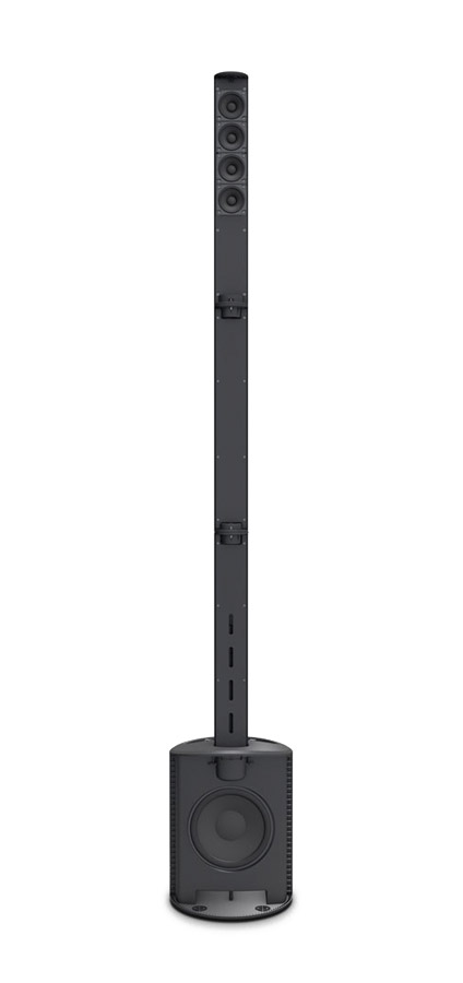 Frequency response: 50Hz – 20kHz. Maximum SPL: 120dB. Dispersion (H x V): 120 x 20 degrees. Protection: DSP multiband limiter plus short circuit, overcurrent and thermal. Weight: 8.5kg, subwoofer; 1.7kg, battery column; 0.8kg, spacer column; 1.3kg, loudspeaker column; 12.3kg, total weight. Dimensions (W x H x D): 305 x 405 x 395mm, subwoofer; 82 x 535 x 105mm, per column; 1989mm total height.
