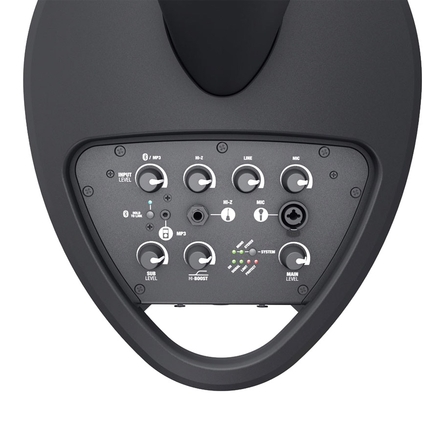 The top of the subwoofer features all audio control along with Bluetooth pairing button and audio channel inputs. A stereo 3.5mm jack socket labelled ‘MP3’ can be used for external audio devices such as MP3 players or compatible audio players. A single 6.3mm high-impedance jack input allows the connection of an instrument such as electro acoustic or electric guitar, and a balanced 3-pin XLR/6.3mm jack combination input provides a microphone connection. Phantom power isn’t provided by the MAUI 5 GO. A combined Bluetooth/MP3 volume control allows for the adjustment of level, whilst separate volume controls for Hi-Z, Line and Mic allow for the mixing of input channels. A ‘Sub Level’ rotary controller allows the user to adjust the level of subwoofer output power, a ‘Hi-Boost’ control allows the user to adjust the high frequency output, and a ‘Main Level’ control allows the total audio output level. Two LEDs illustrate the mode (Mono/Stereo) of the system, and four LEDs show the operator power on, signal present, limit, and protect (in the case of overheating or overloading) status at a glance.