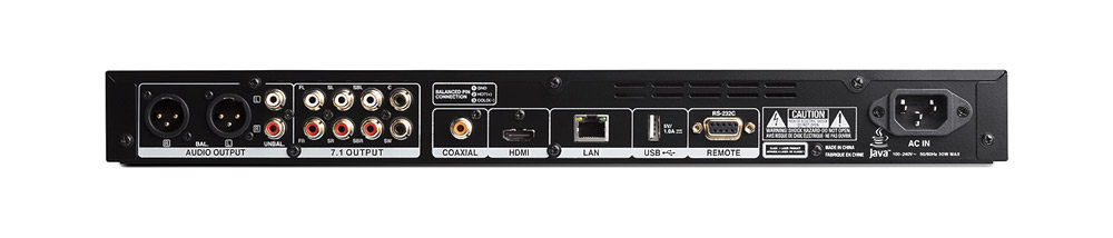 Balanced (R/L) audio is available via 3-pin male XLRs and unbalanced audio output via RCA (phono) sockets. The DN-500BDMKII also provides discrete 7.1 channel analogue outputs via RCA sockets, for onward connection to an AV receiver, amplifier or powered loudspeakers. Digital audio output is via coaxial RCA socket. A HDMI socket completes the AV output from the Blu-ray player.