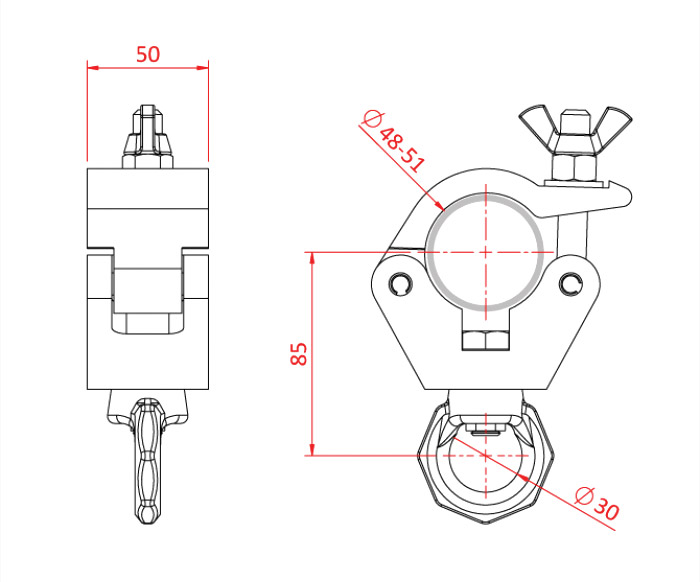 A high tensile extruded aluminium trigger clamp that is suitable for 48mm to 51mm diameter tubes. It has a WLL (working load limit) of 200Kg and is 30mm wide. Slotted to hold captive an M12 nut or bolt head. Frequently employed to hang large moving heads on trussing as it will not damage the cords.