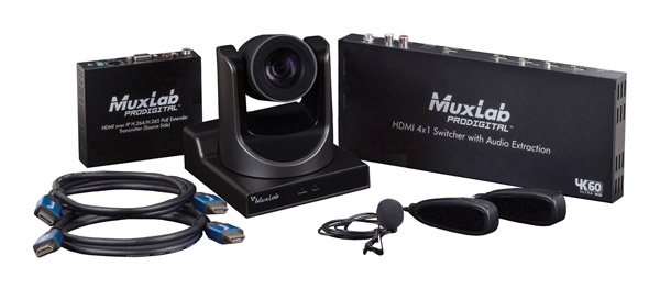 The kit includes an AV over IP transmitter, a single 500791 1080p PTZ camera, wireless lavalier microphone kit operating on the 2.4GHz frequency band, and HDMI cable. The user can download MuxStream Control App (for iOS and Android tablets, and Windows compatible PC) free of charge. This allows the user to manage the system set up, configure the transmitter, and manage the camera settings including pan, tilt, and zoom.