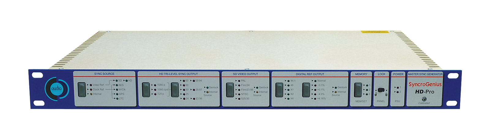 The input reference may be selected, video formats are auto detected. All HD frame rates may be selected in progressive scan and interlaced 1080 or 720 modes, when internal mode is selected. The relevant SD frame is automatically generated to feed the SD outputs. HD and SD outputs can reproduce any video input reference or be set to the internal master house sync. Simultaneous AES and word clock outputs are genlocked and phase coherent to the input reference. Pull up/down sample rates are adjustable to suit all film, video and audio applications. True DDS direct digital synthesis leads to ultra-low jitter performance and ultra high frequency stability.