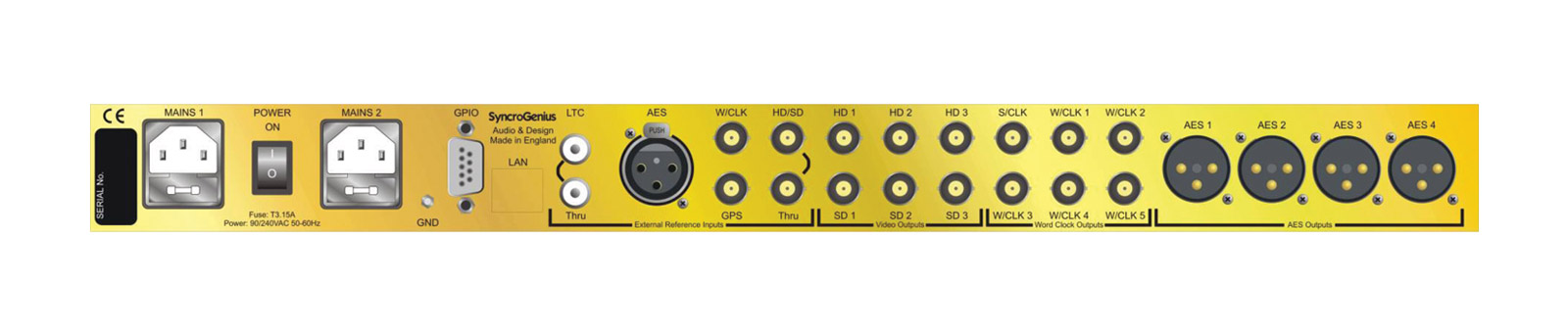 The rear panel has an IEC power inlet with adjacent switch. External reference inputs are a pair of RCA(phono) connectors for LTC input and loop-out, a female XLR connector for AES audio input, four BNC connectors provide word-clock, GPS and HD/SD inputs, HD/SD loop out. Six BNC connectors offer three HD and three SD video outlets. A further six provide four 1x, one 2x and one 4x word clock outputs. Four male XLR connectors are used for the AES outputs. A 9-pin D-sub connector is used for a general purpose interface providing PSU output or lost-lock status; contacts close to signal a fail condition.