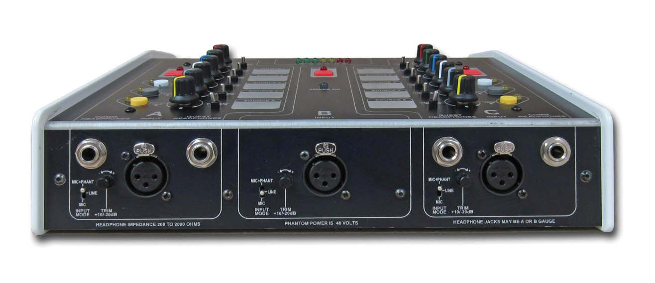 The rear facing panel of the unit houses all I/O connectivity including dual 6.35mm balanced jack headphone outputs, a 3-pin XLR microphone input with switchable +48V phantom power, switchable (on/off) compression, and associated rotary gain controller. I/P 1 and I/P 2 inputs are by way of 3-pin XLR, and Program output and Lazy/Talkback outputs are by way of independent 3-pin XLR connector. 100-240V AC power is via IEC.