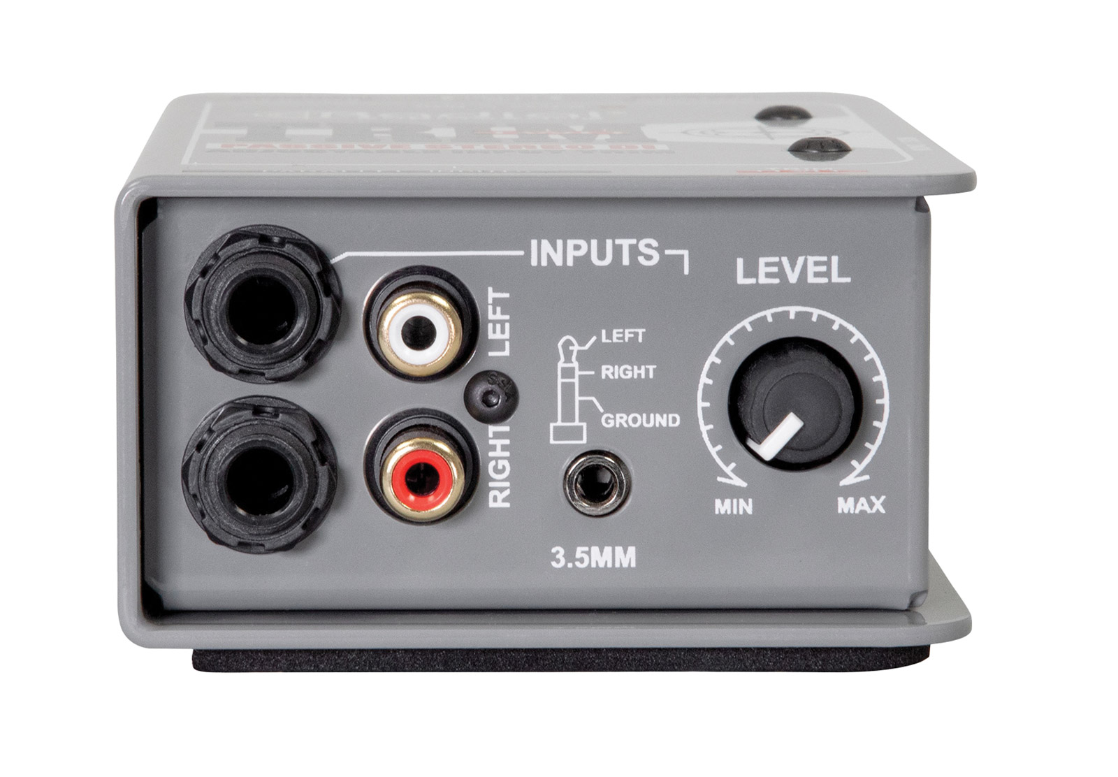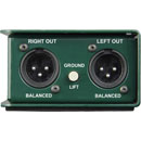 A custom-wound transformer is employed to convert the impedance and balance the line while providing common-mode rejection. The transformer also eliminates noise associated with ground loops. To further reduce susceptibility to noise, the transformer is encapsulated in a nickel metal can, thus preventing RF and electromagnetic induction. Input connectivity includes dual RCA (phono), dual 6.35mm jack and a single 3.5mm jack for high-impedance instrument and -10dB consumer line-level devices. All inputs may be used as thru-puts and are auto merged to mono to reduce cable infrastructure and audio channel requirements. The output is 3-pin XLR for direct interconnect to mixing console mic inputs. Switching includes input ground lift, -10dB pad, and global output ground lift.