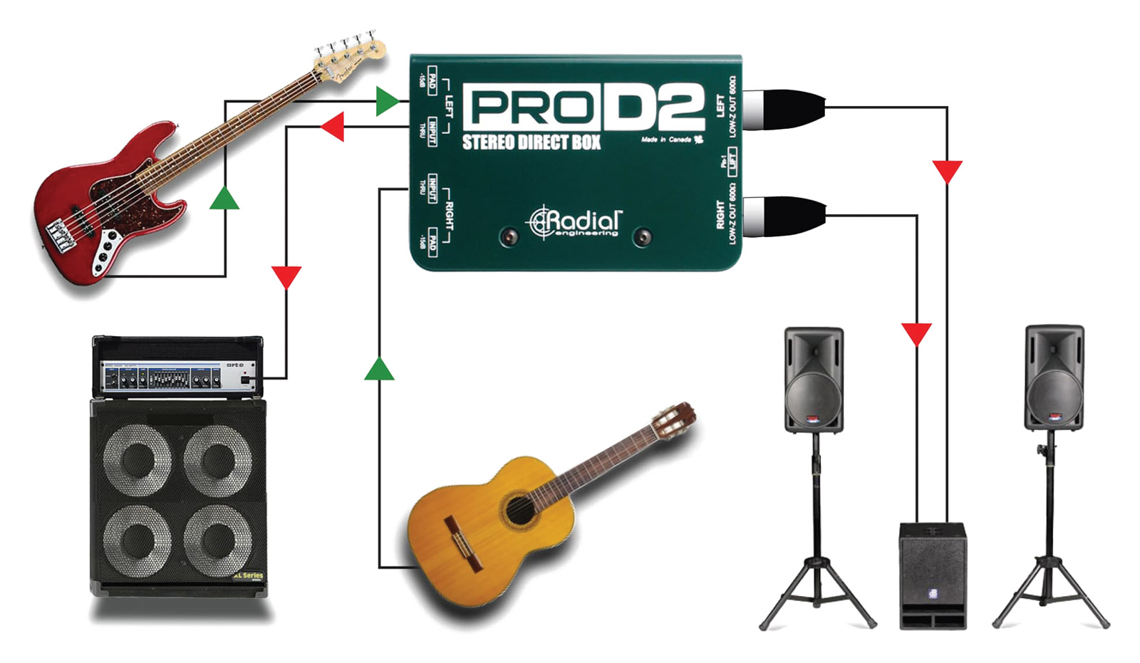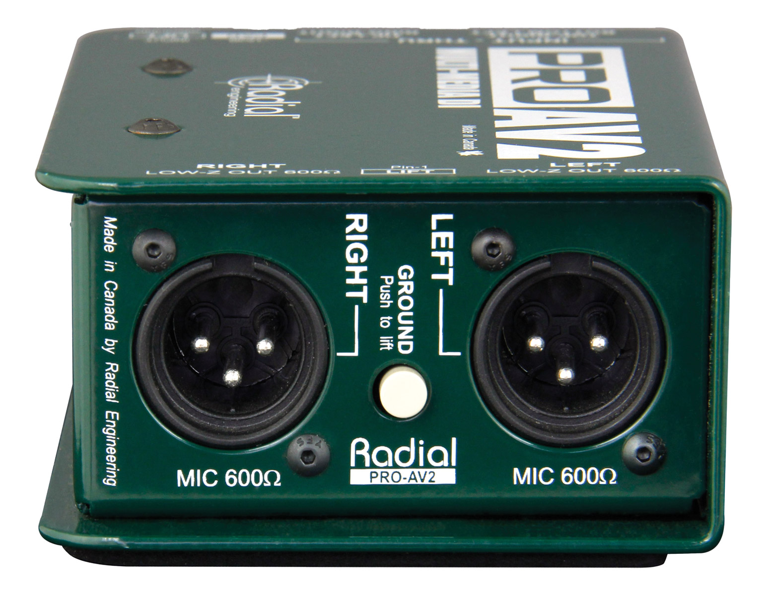 Radial ProAV2 is a dual channel passive direct box designed specifically for the audio-video professional where ‘Swiss Army knife’ connectivity is required to meet on-the-fly demands of AV rentals and installations. ProAV2 has been designed for use with portable computers, CD players, iPods and other sound sources that must interface to PA systems alongside microphone lines.