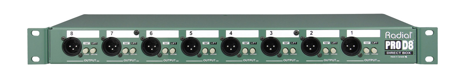 ProD8 is equipped with eight custom wound Radial transformers, each encapsulated inside a nickel mu-metal (a nickel–iron soft ferromagnetic alloy) can to reduce noise and distortion caused by outside magnetic fields. To accommodate high output instruments and line level equipment, a -15dB pad is provided on the input panel. Balanced 3-pin XLR outputs are equipped with polarity reverse, ground lift and chassis ground switches to help interfacing with stage and studio environments. For added flexibility, reversible rack ears allow either panel to face front.