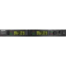 This has a half rack-width enclosure. The interactive menu system allows the setting of RF group, channel, frequency, RF power, stereo/mono/point-to-point (to a UHF-R receiver, which requires pilot tone) transmission, +4dBu/-10dBV input level. Utility settings include: Name of transmission (uploaded to body pack with Sync), display format and contrast, four control locking options. Sent to body pack with Sync: Body pack lock, volume limiter, stereo/mono, mixed mode/stereo mode, high frequency boost.