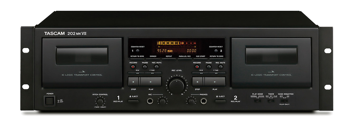 Tascam 202MKVII 3U rack-mounting, dual cassette deck is intended for use in 'professional studios, houses of worship and other installations needing reliable cassette performance'. The two twin-head decks can be used for recording or playback, supporting normal (Type I), chrome (Type II), and metal (Type IV) tapes.