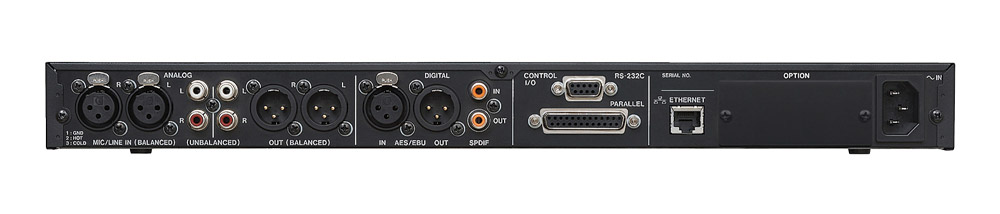 It has balanced and unbalanced I/O and AES/EBU digital I/O. The optional IF-DA2 DANTE card offers 2-channel audio inputs and outputs at 16/24bits and 44.1/48/96kHz sampling rate. RS-232C serial control connection allows the connection of a RC-SS150 optional hard-wired remote.