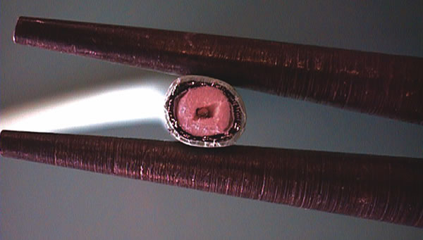 Crushing the cable or other installation damage has possibly the most serious implications for the reliability of any installed cable run. This type of damage is easily inflicted and will quickly cancel out any electrical advantages in the cable specifications on paper, whilst the vulnerability of any particular cable is harder to specify. Figures 5 and 6 show a simple self-explanatory test for crush resistance. Notice the striking difference in cross-section squashing which has resulted from the same crushing force on these two cables that were first shown in Figure 4. It is not hard to guess how much better the SDV-L cable shown in Figure 6 would perform in any practical installation.
